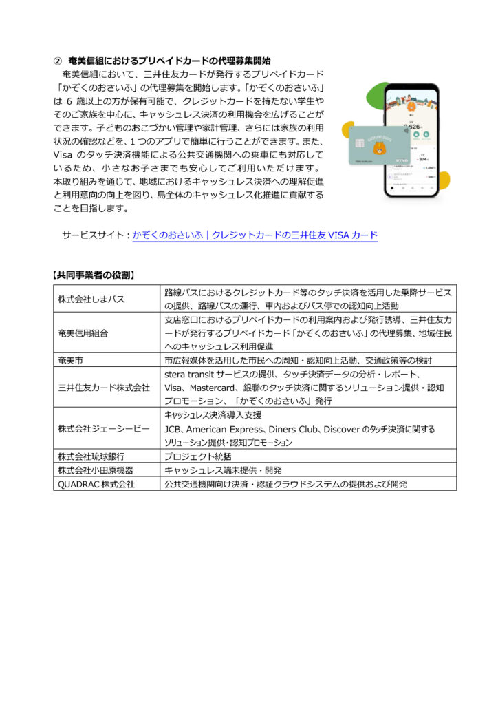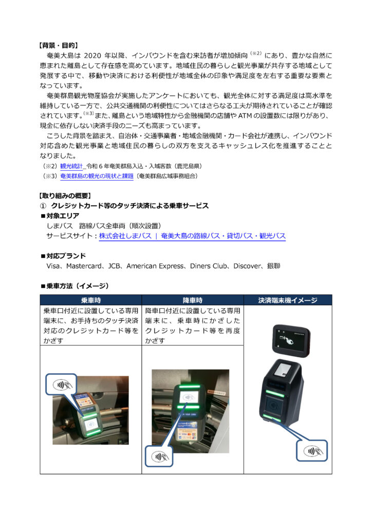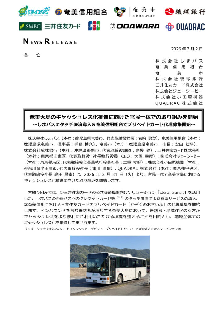 しまバス、車内タッチ決済導入へ始動! 2026年3月2日 最終更新日時 : 2026年3月2日 運用担当 奄美大島のキャッシュレス化推進に向けた官民一体での取り組みを開始! ~しまバスにタッチ決済導入!&奄美信用組合でプリペイドカード代理募集開始~ FacebookXBlueskyHatenaCopy
